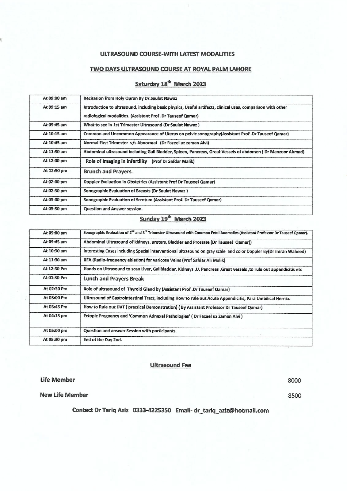 Home 2 Days Ultrasound Course at Royal Palm Lahore on 18-19 march 2023 byDr Tariq Aziz -9:11 PM Facebook Twitter